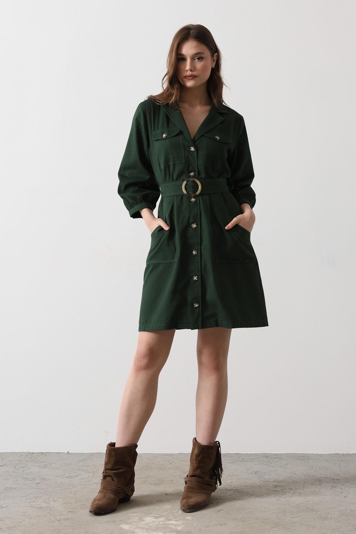 Belt Detailed Gabardine Dress – – Khaki