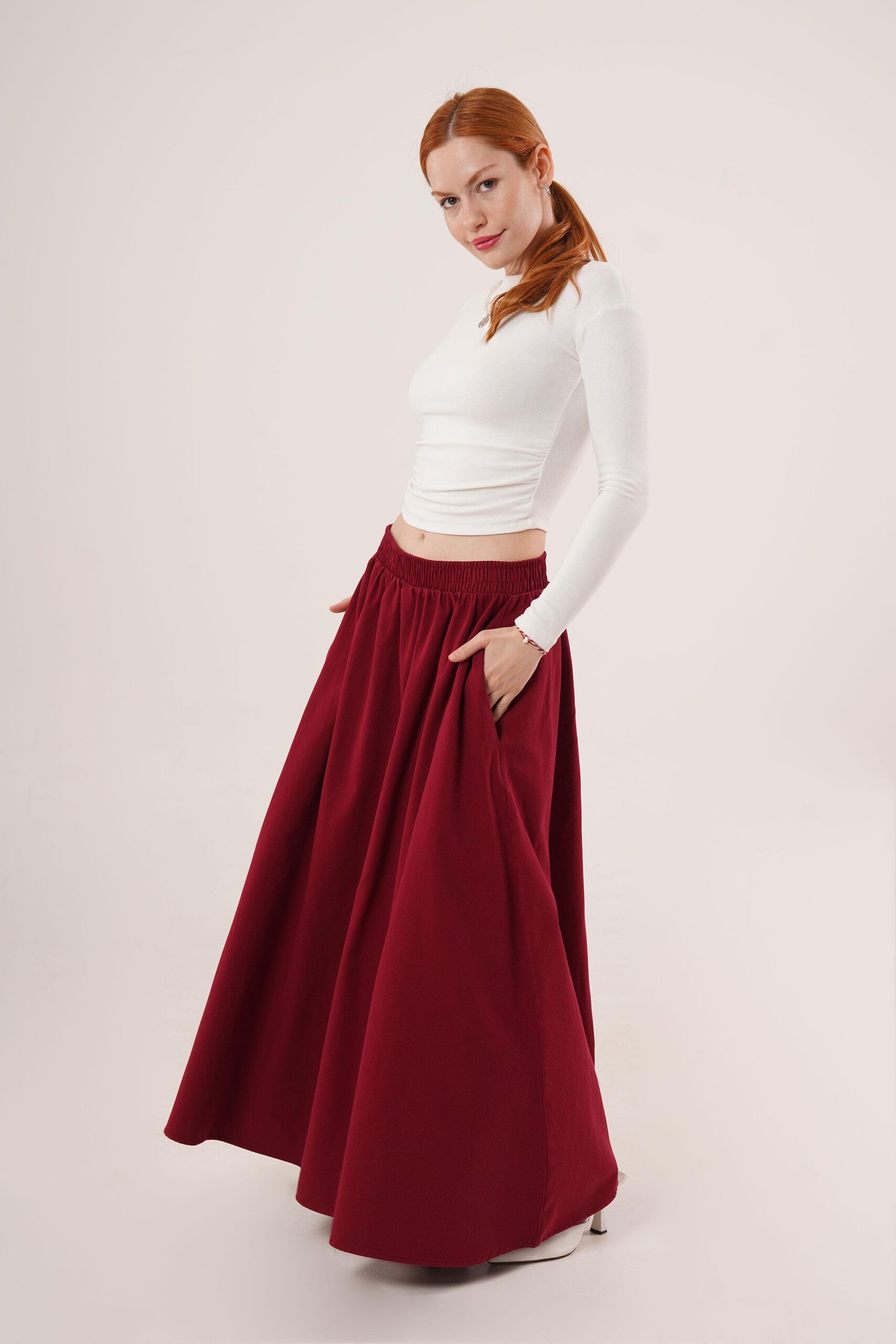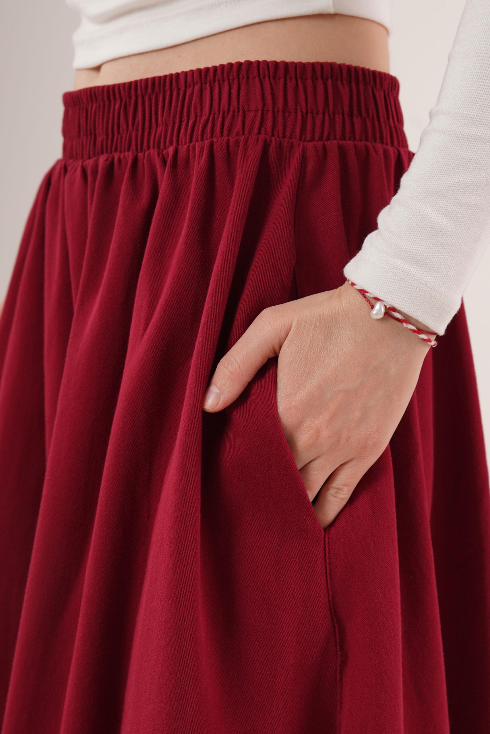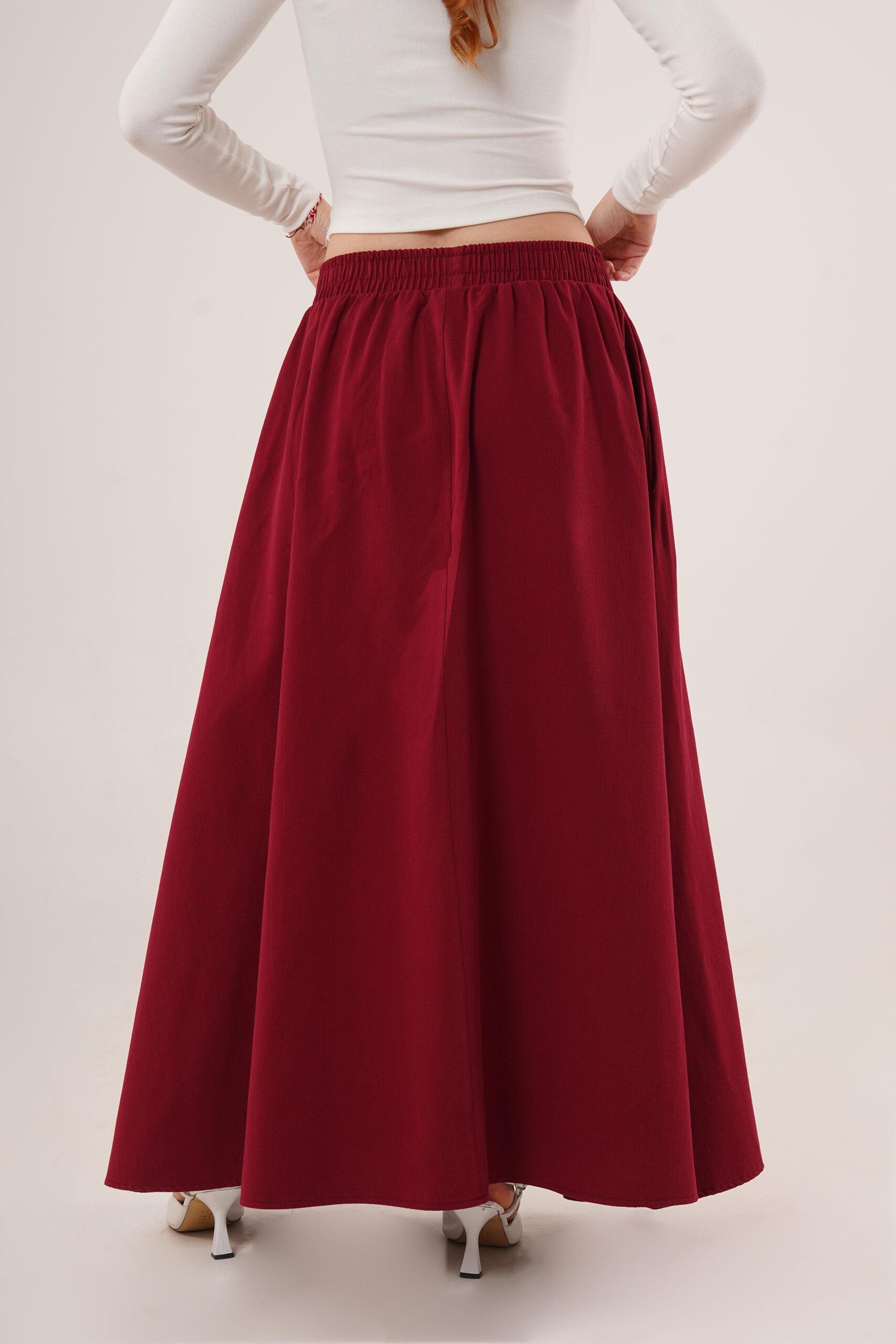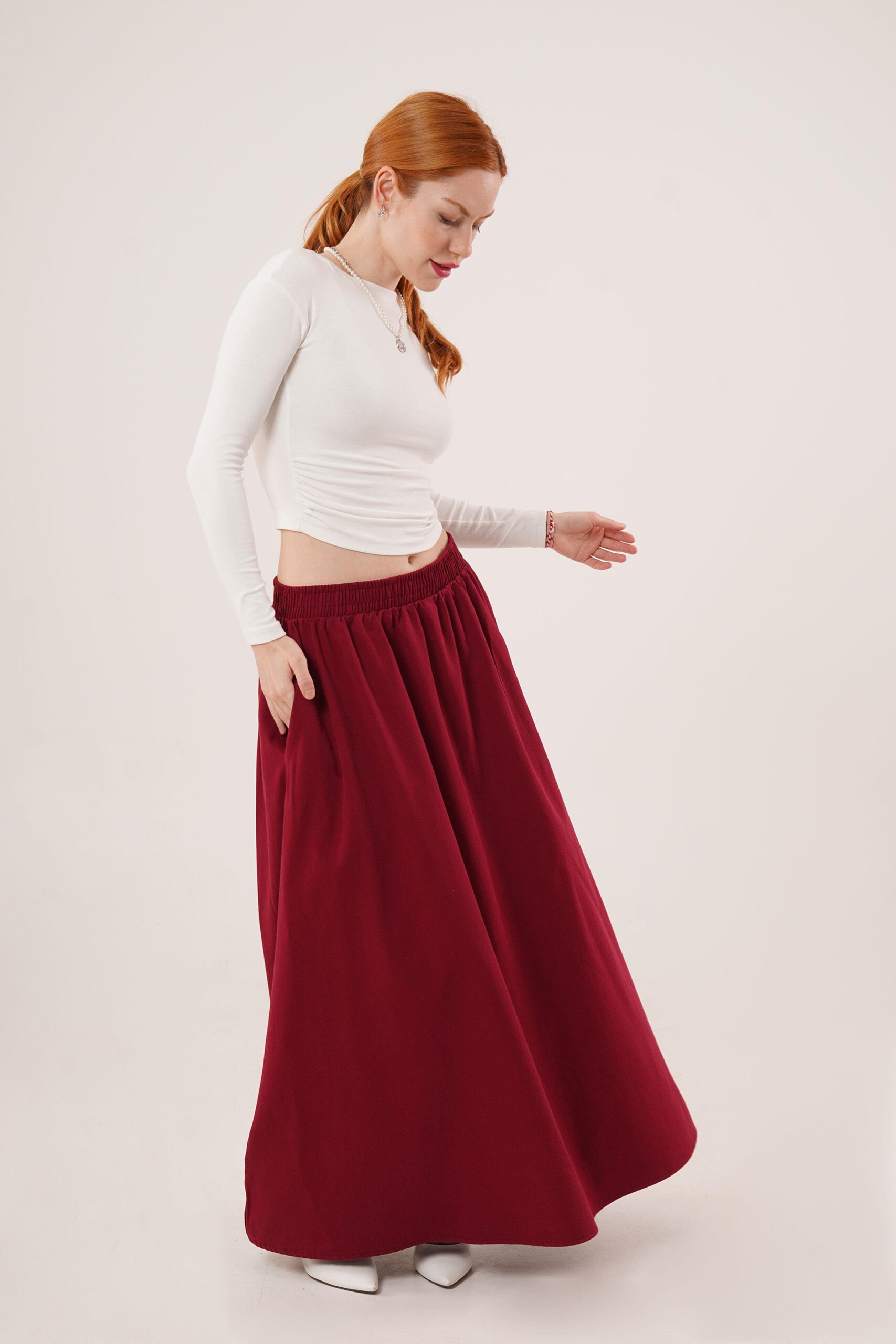 Elastic Waist Pocket Detailed Long Burgundy Wholesale Skirt