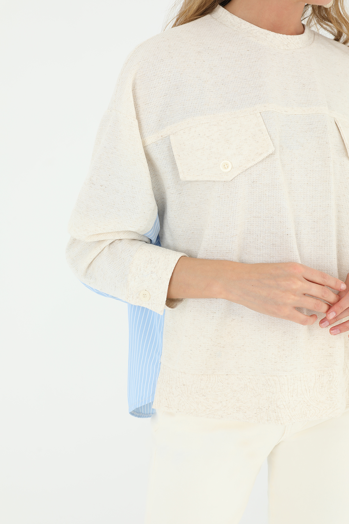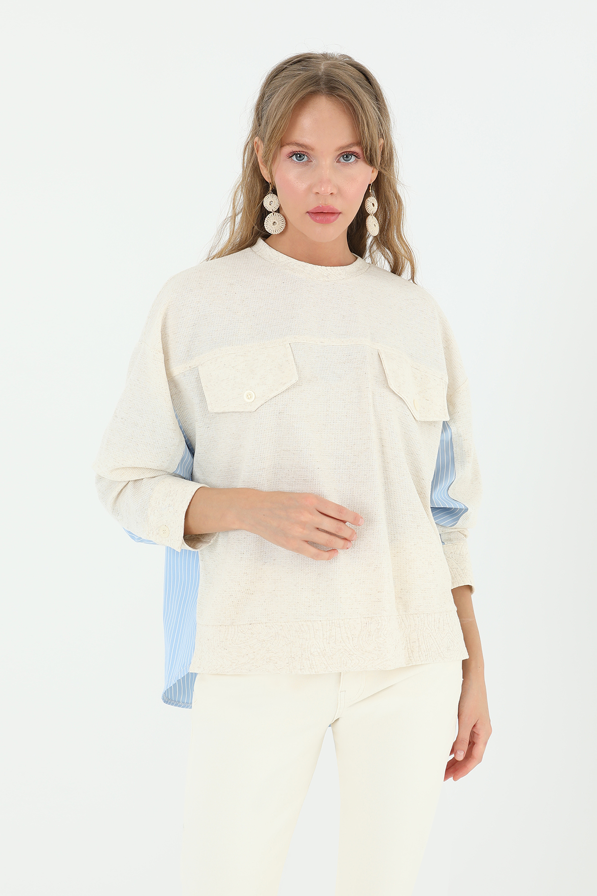 Front Pocket Back Poplin Blouse – Beige & Blue