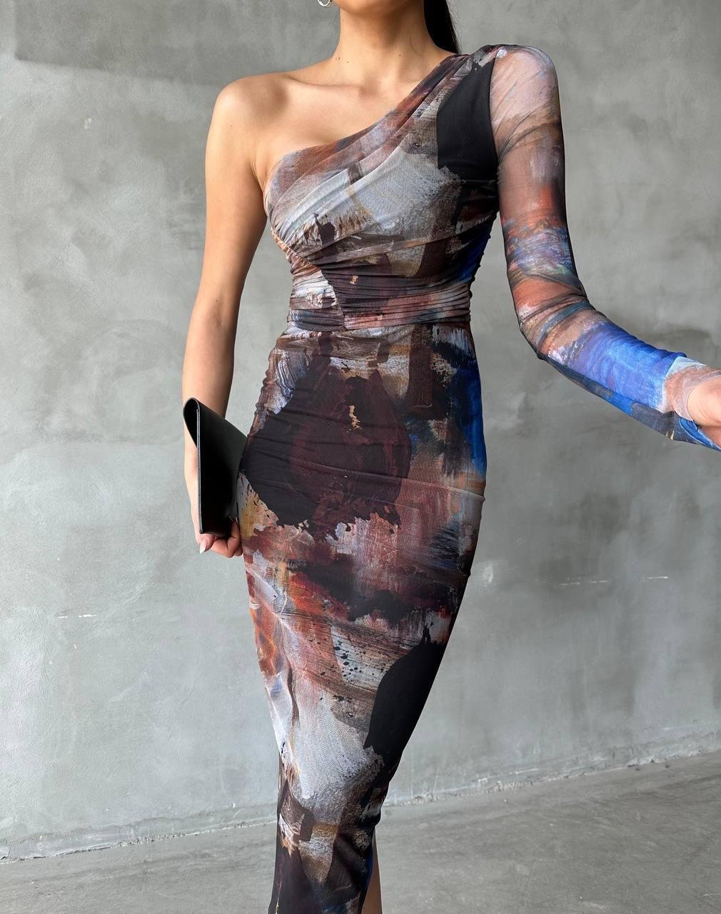 Pastel Pattern One Sleeve Dress – Brown