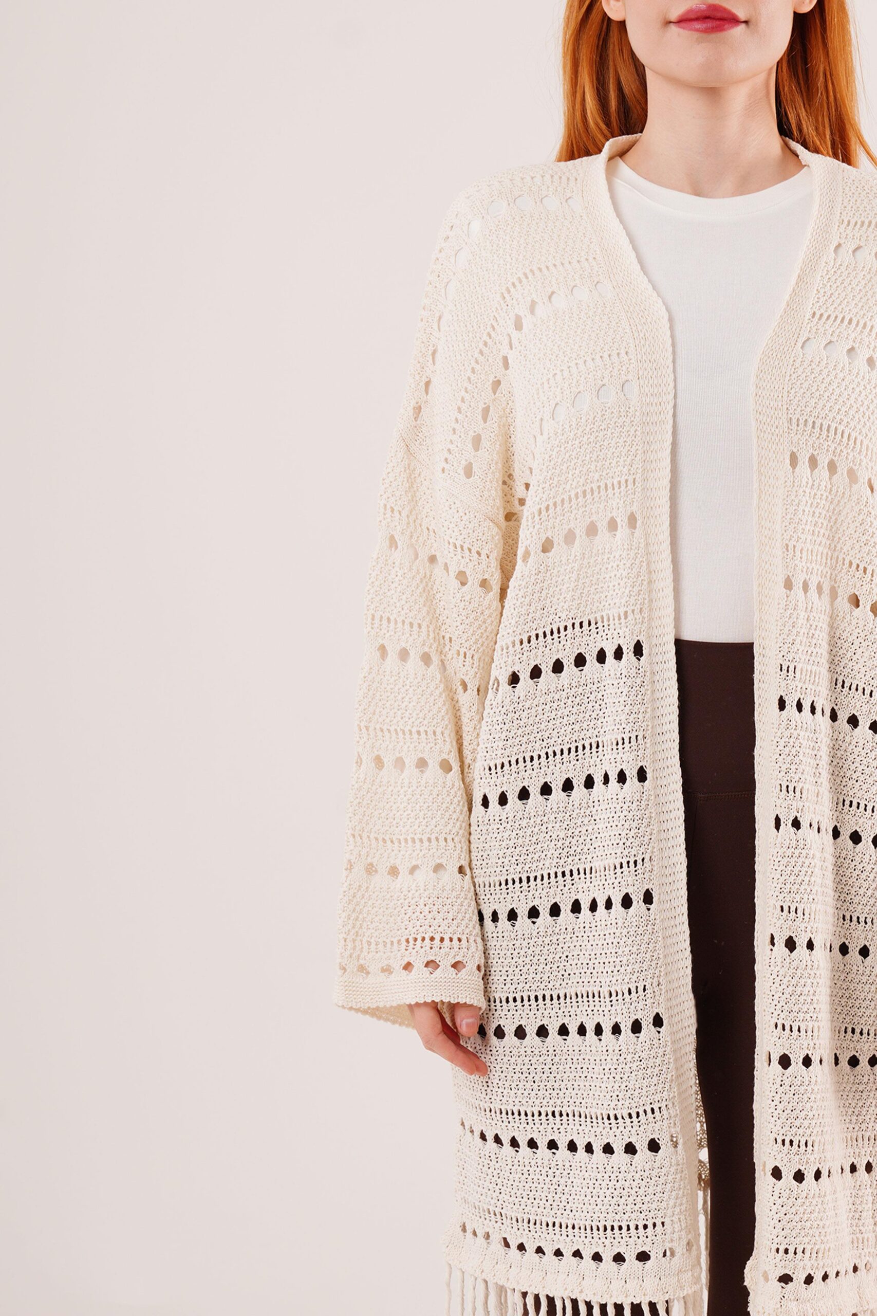 Perforated Transitional Tassel Detail Long Knitwear WholesaleCardigan