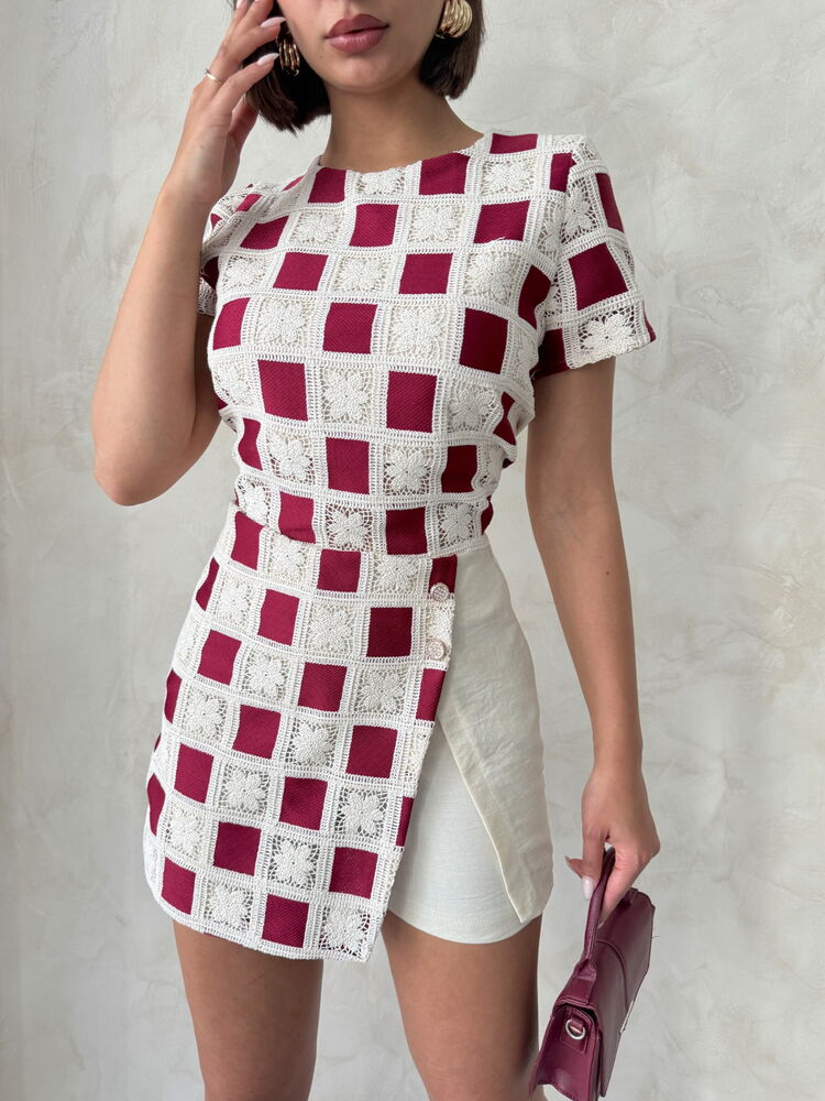 Short Sleeve Checkered Blouse – Raw Burgundy