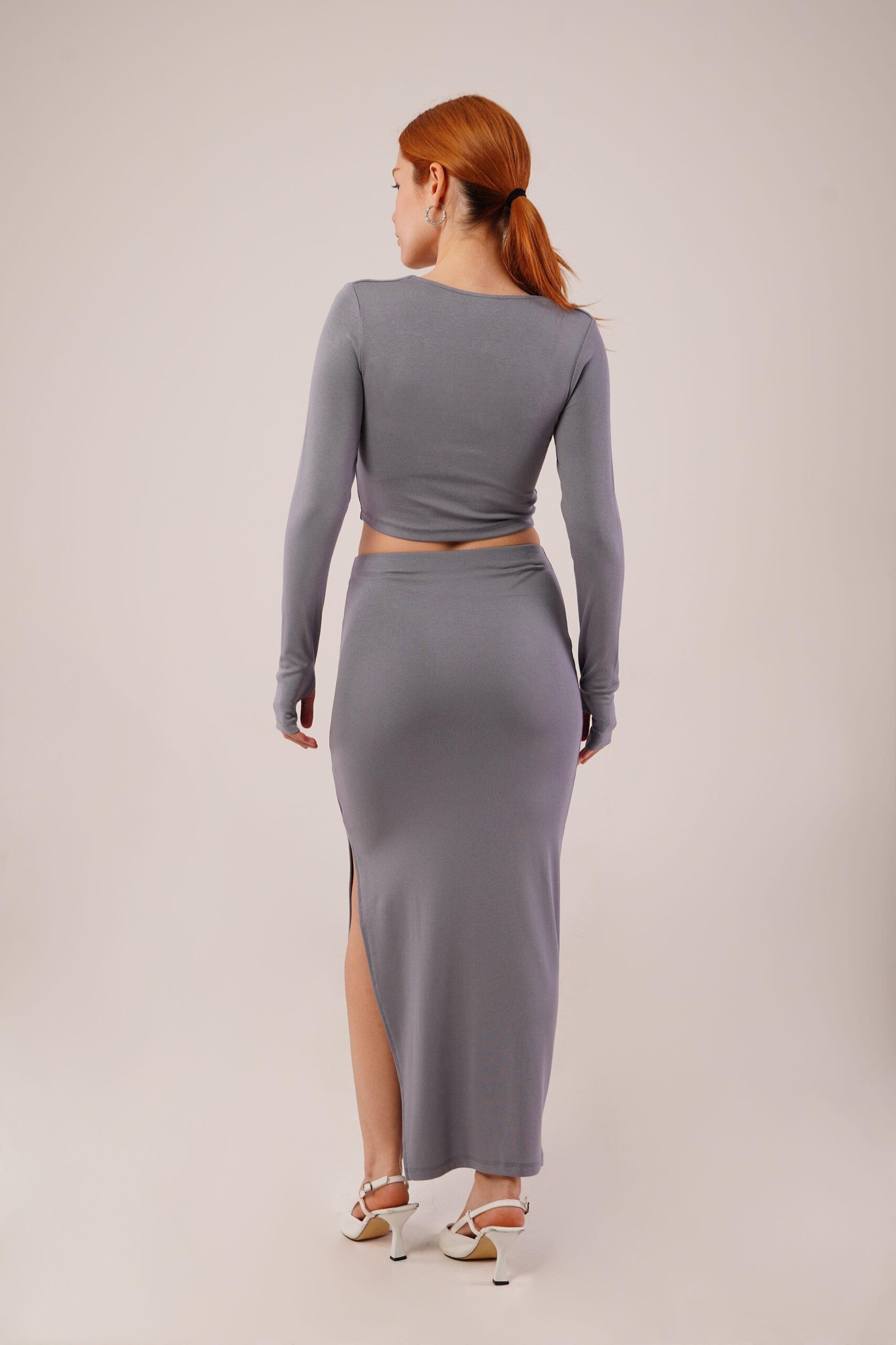Square Collar Blouse And Slit Detailed Skirt Wholesale Double Gray Suit