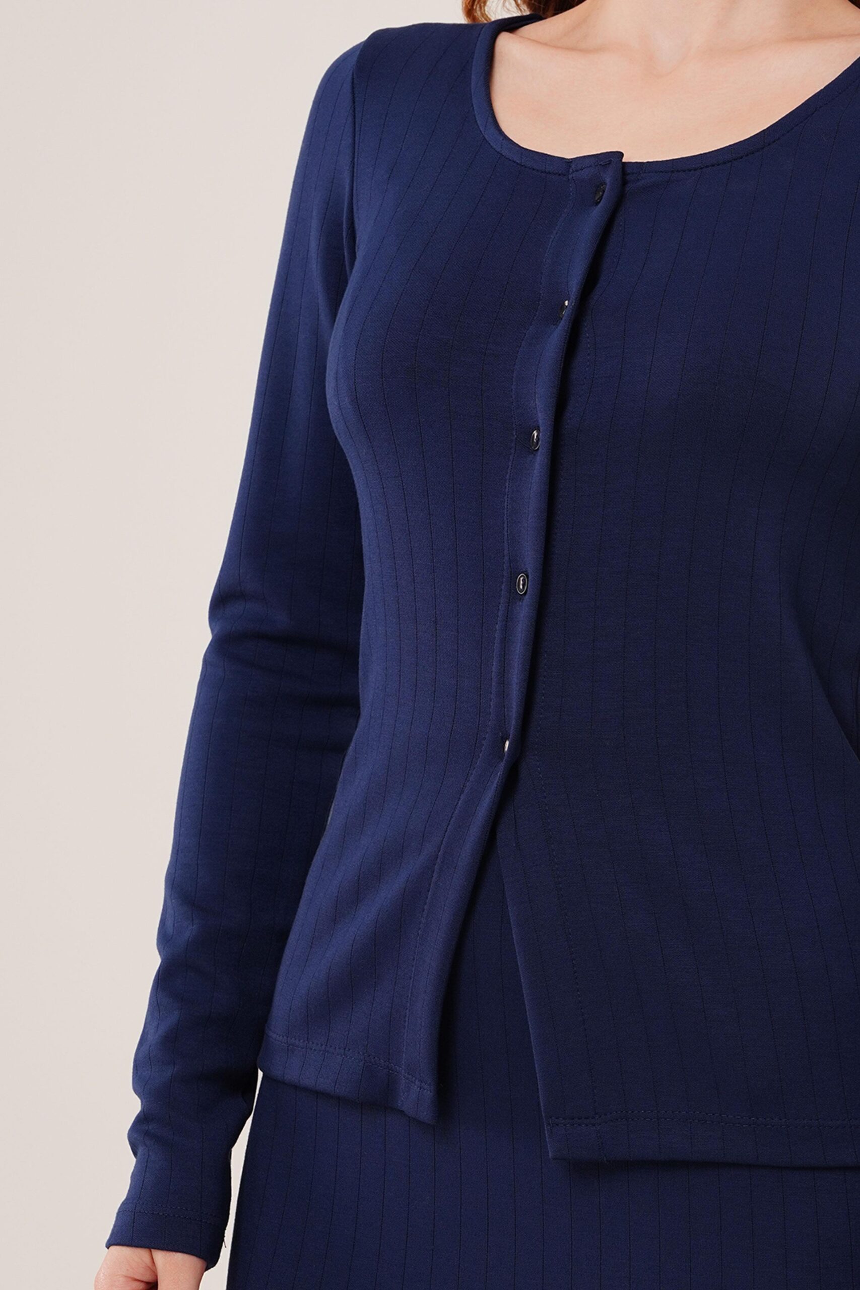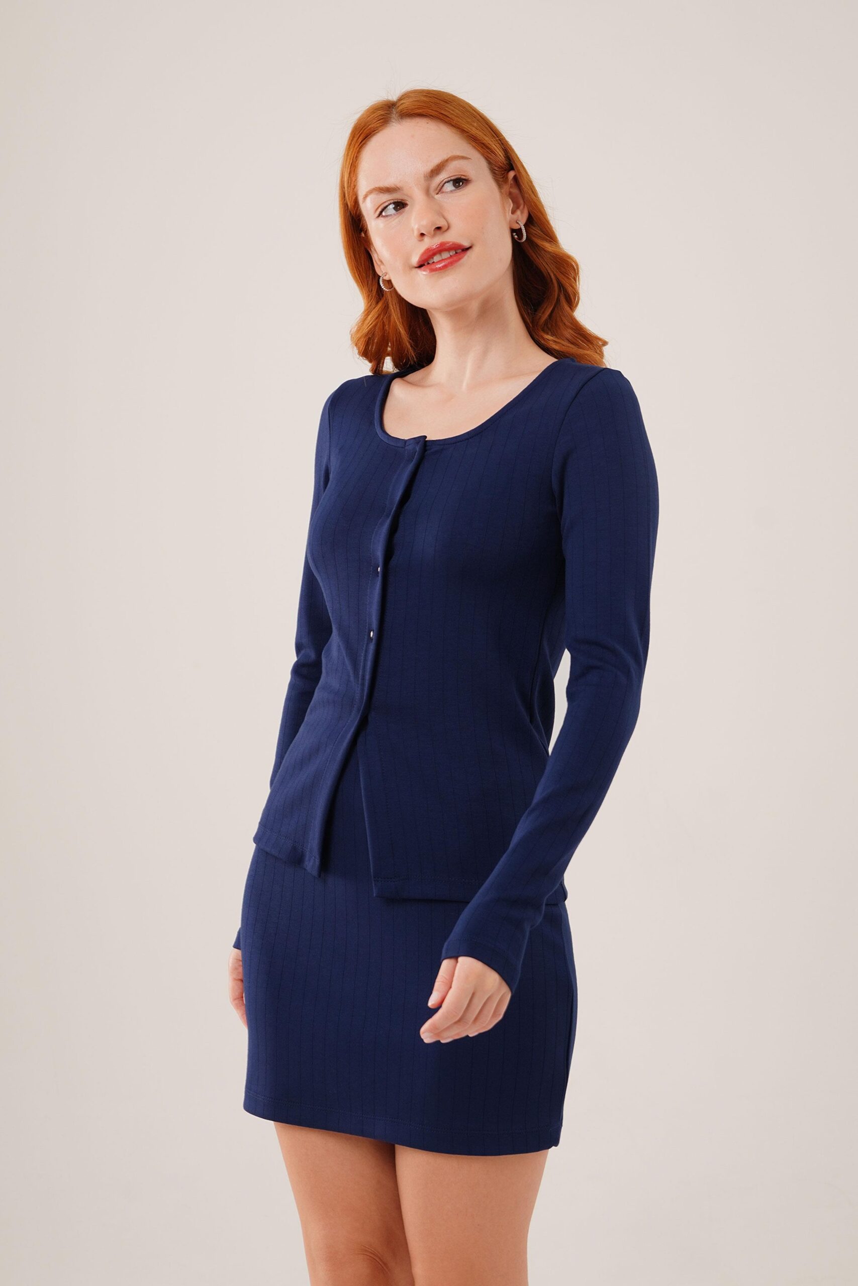 Striped Skirt Buttoned Blouse Wholesale Navy Suit