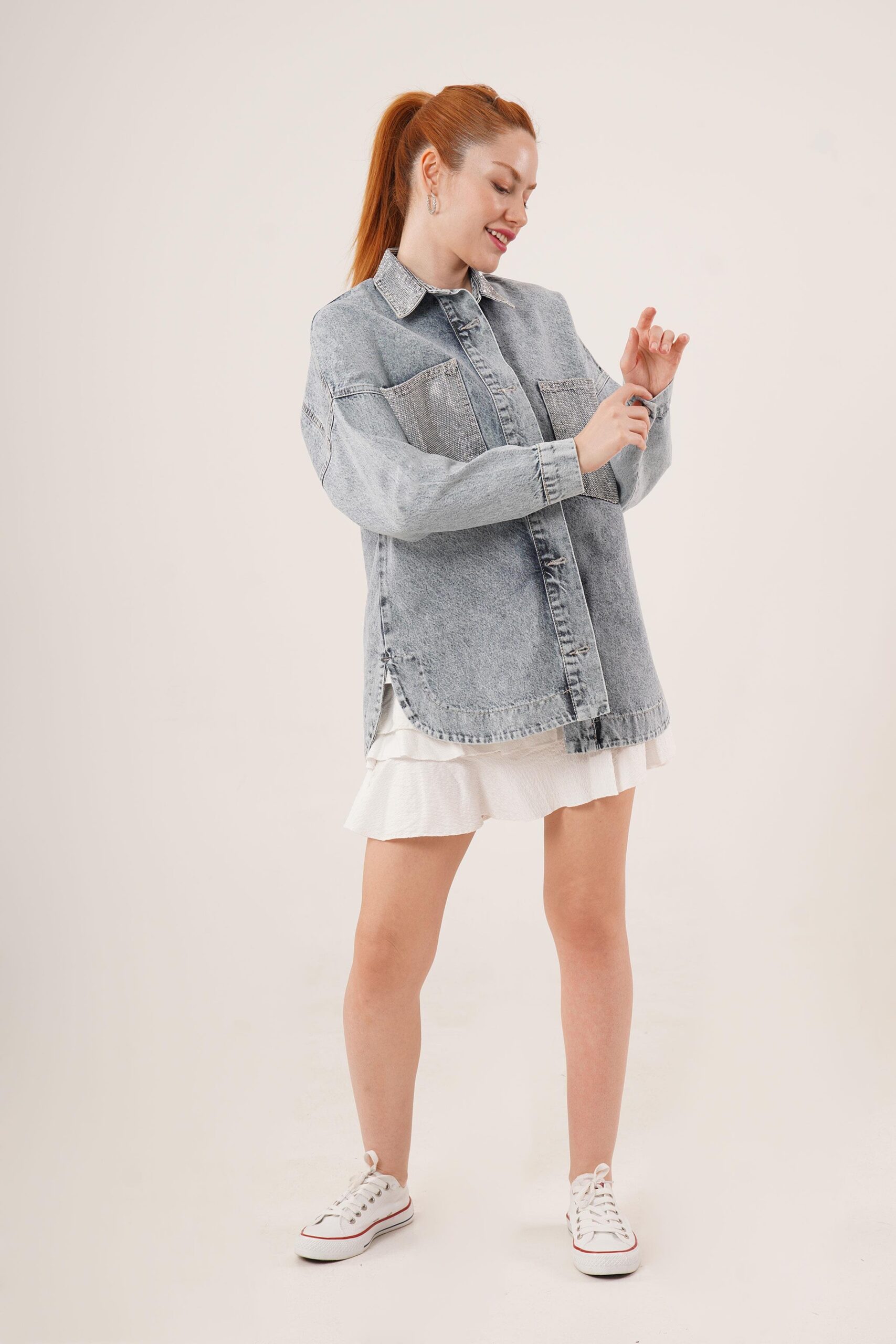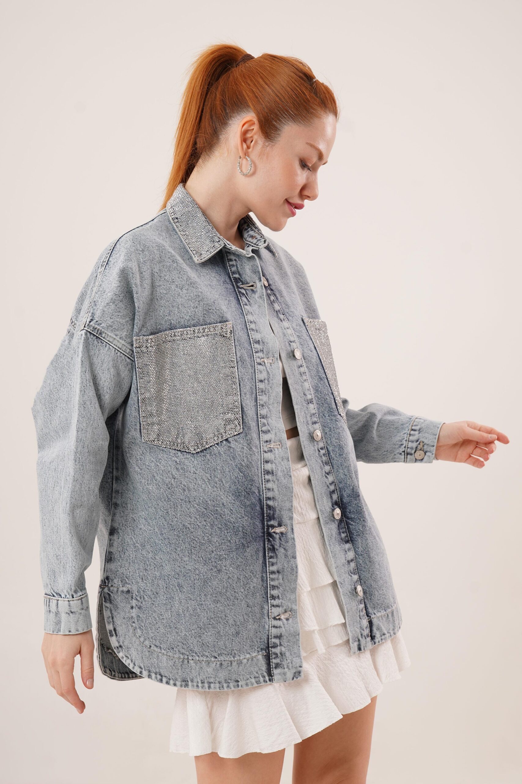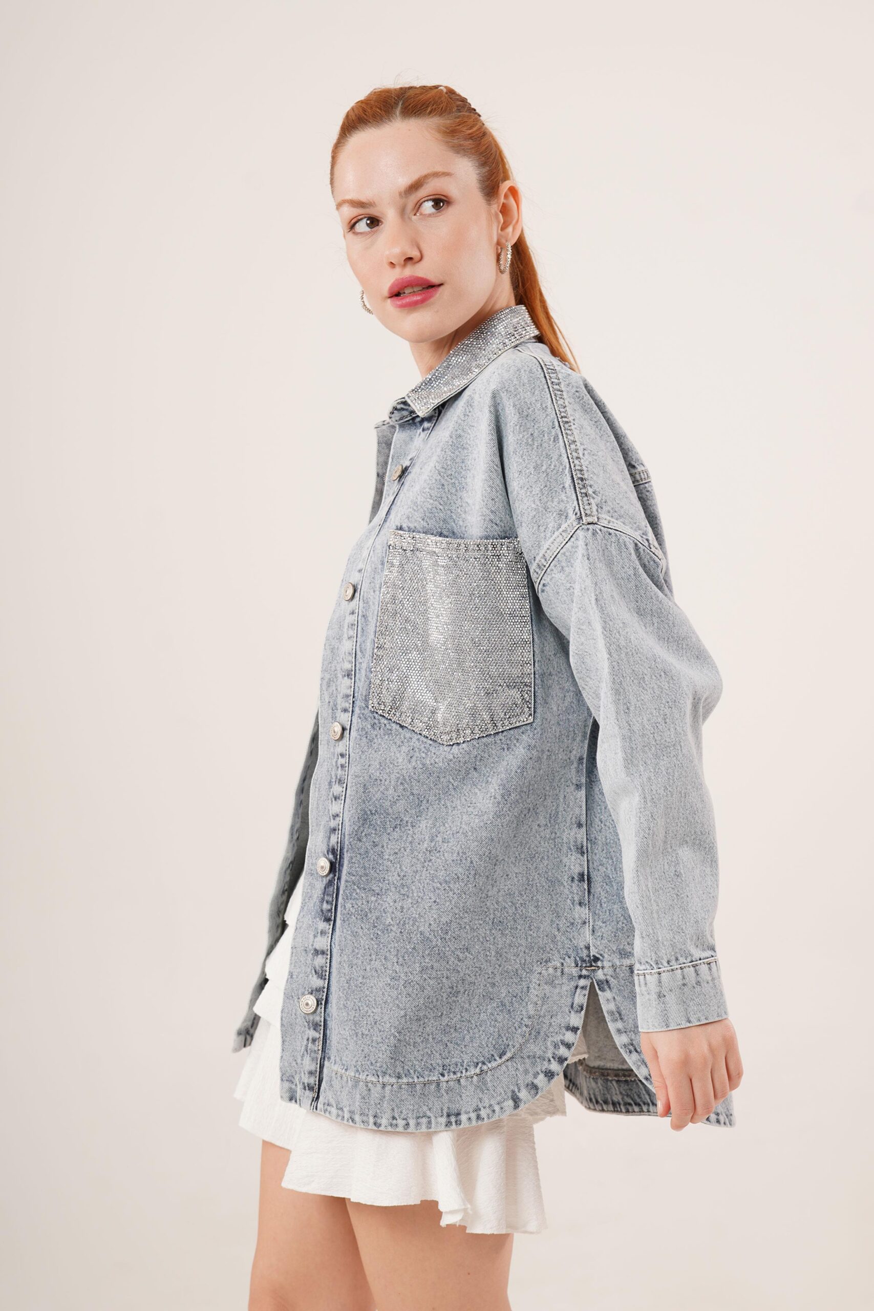 Wholesale Blue Jean Jacket With Stone Buttons With Pockets And Collar